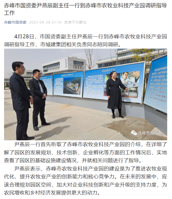 赤峰市國資委尹燕辰副主任一行到赤峰市農(nóng)牧業(yè)科技產(chǎn)業(yè)園調(diào)研指導(dǎo)工作