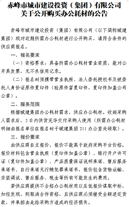 下一篇:赤峰市城市建設(shè)投資(集團(tuán))有限公司 關(guān)于公開購(gòu)買辦公用品的公告