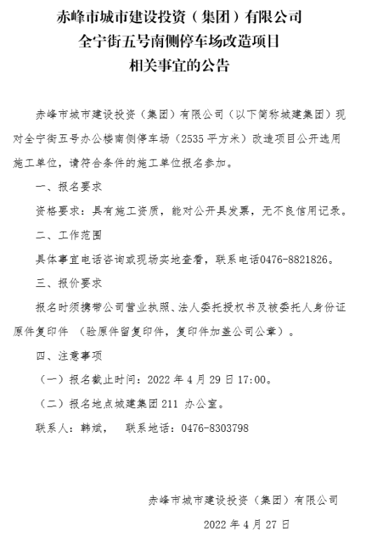 赤峰市城市建設(shè)投資(集團(tuán))有限公司 全寧街五號南側(cè)停車場改造項目 相關(guān)事宜的公告