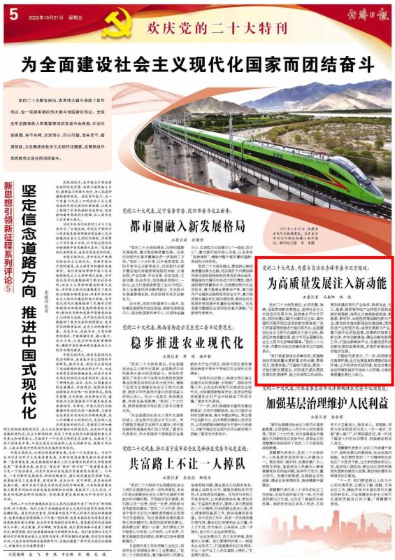 黨的二十大報(bào)告提出,必須完整、準(zhǔn)確、全面貫徹新發(fā)展理念,堅(jiān)持社會(huì)主義市場(chǎng)經(jīng)濟(jì)改革方向,堅(jiān)持高水平對(duì)外開放,加快構(gòu)建以國(guó)內(nèi)大循環(huán)為主體、國(guó)內(nèi)國(guó)際雙循環(huán)相互促進(jìn)的新發(fā)展格局?!拔覀儗⒕o緊圍繞推進(jìn)中國(guó)式現(xiàn)代化、全面建設(shè)社會(huì)主義現(xiàn)代化國(guó)家這個(gè)奮斗目標(biāo),推動(dòng)經(jīng)濟(jì)高質(zhì)量發(fā)展,奮力書寫全面建設(shè)社會(huì)主義現(xiàn)代化赤峰新篇章?!秉h的二十大代表、內(nèi)蒙古自治區(qū)赤峰市委書記萬(wàn)超岐表示。